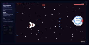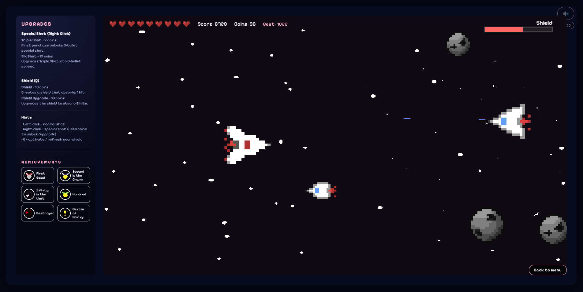 You control a tiny ship in an endless starfield, dodging asteroids and enemy fire while upgrading your weapons and shield.